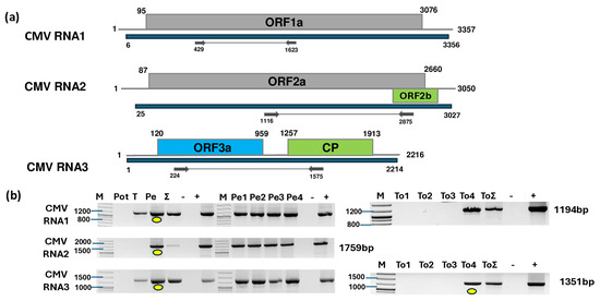 Results indicating the presence of CMV. (a) Schematic representation of the CMV genome and the positions of the primers used for RT-PCR validation. The blue line indicates the region covered by the HTS sequencing results. (b) RT-PCR results for virus validation. M represents the GeneRuler 100 bp Plus DNA Ladder; Pot indicates potato; T indicates tomato; Pe indicates the pepper pool; Σ denotes the combined pool of Pot, T, and Pe that was sequenced; −/+ stand for negative and positive controls, respectively; Pe1, Pe2, Pe3, and Pe4 denote individual pepper plants; and To1, To2, To3, and To4 denote individual tomato plants. Yellow dots indicate the products that were cloned and sequenced.