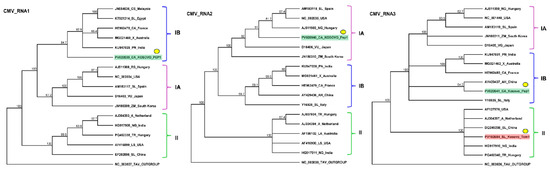To validate the presence of all three segments of CMV and inspect its presence in the different species and individuals, we designed primers based on the contig sequences and sequences of diverse CMV variants (Table S5). RT-PCR revealed the presence of CMV in the tomato and pepper pools. Only one tomato and all four pepper individuals were infected with the virus (Figure 1b). For tomato, we cloned and sequenced the PCR products of RNA3 using the cDNA prepared from the individuals as a template (GenBank accession number PV102684) (Table S6). For pepper, the PCR products originating from the cDNA prepared from the pepper pool served as the template. These products were subjected to Sanger sequencing and SNP analysis. As the PCR products showed no SNPs, we cloned and sequenced these products amplified from RNA1, RNA2, and RNA3 (GenBank accession number PV020939-41) and used them for phylogenetic analysis (Table S7). The sequencing of the presented CMV variants revealed that the tomato plant was infected with a variant belonging to the less virulent subgroup II of CMV (Figure 2).
