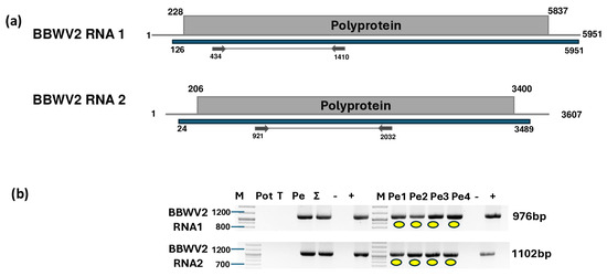 Results indicating the presence of BBWV2. (a) Cartoon representation of the BBWV2 genome and the positions of the primers used for RT-PCR validation. The blue line indicates the region covered by the HTS sequencing results. (b) Validation of the presence of BBWV2 using RT-PCR. M represents the GeneRuler 100 bp Plus DNA Ladder; Pot indicates potato; T denotes tomato; Pe indicates the pepper pool; Σ denotes the combined pool of Pot, T, and Pe that was sequenced; −/+ indicate negative and positive controls, respectively; and Pe1, Pe2, Pe3, and Pe4 denote individual pepper plants. Yellow dots indicate the products that were cloned and sequenced.