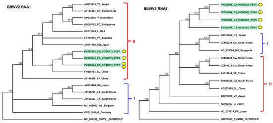 The sequencing of the amplified portions of RNA1 and RNA2 BBWV2 revealed three and four slightly different variants clustering together into subgroup II and between the two BBWV2 subgroups, respectively (Figure 4). These variants were significantly different from the BBWV2 variants in GenBank (78–92% identity for RNA1 and 80–86% identity for RNA2). The RNA1 of the BBWV2 KOSPep sequences was the most similar to a variant sequenced in China from a tomato (FN985164 in subgroup II with 92% identity), while RNA2 showed the closest similarity (AB013616 in subgroup I with 87%) to a variant sequenced from Vicia faba in Japan (Table S9).