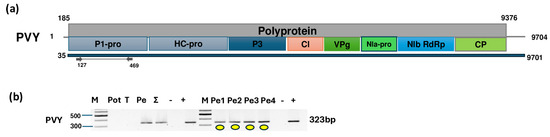 Results indicating the presence of PVY. (a) Cartoon representation of the PVY genome and the positions of the primers used for RT-PCR validation. The blue line indicates the region covered by the HTS sequencing results. (b) Results validating the presence of PVY RT-PCR. M represents the GeneRuler 100 bp Plus DNA Ladder; Pot indicates potato; T indicates tomato; Pe denotes the pepper pool; Σ denotes the combined pool of Pot, T, and Pe that was sequenced; −/+ denote negative and positive controls, respectively; and Pe1, Pe2, Pe3, and Pe4 denote individual pepper plants. Yellow dots indicate the products that were cloned and sequenced.