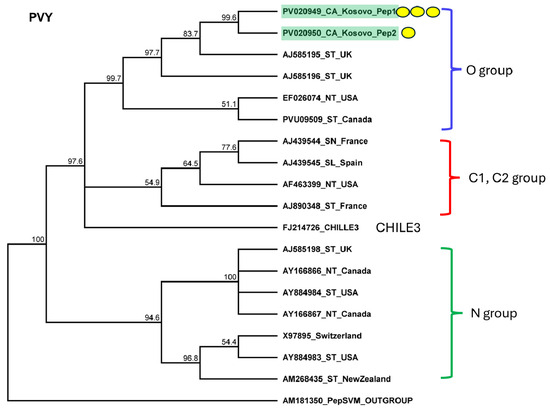 Phylogenetic analysis of the PVY variants found in Kosovo. The analysis was conducted using Geneious Tree Builder with the Tamura–Nei model, the neighbor-joining method, and 1000 bootstrap replicates. Green boxes highlight the pepper variants sequenced in this study. The colored line shows the subgroups of PVY. Yellow dots indicate the variants sequenced in this study. The sequences are indicated by their GenBank accession numbers. The middle panel of the legend indicates the host plant using the following abbreviations: ST—Solanum tuberosum, NT—Nicotiana tabacum, SN—Solanum nigrum, and SL—Solanum lycopersicum.