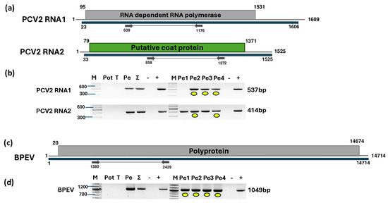 Results indicating the presence of PCV2 and BPEV. Cartoon representation of the (a) PCV2 and (c) BPEV genomes and the positions of the primers used for RT-PCR validation. The blue line indicates the region covered by the HTS sequencing results. (b) and (d) show the validation results indicating the presence of PCV2 and BPEV using RT-PCR, respectively. M represents the GeneRuler 100 bp Plus DNA Ladder; Pot indicates potato; T indicates tomato; Pe indicates the pepper pool; Σ denotes the combined pool of Pot, T, and Pe that was sequenced; −/+ represent negative and positive controls, respectively; and Pe1, Pe2, Pe3, and Pe4 denote individual pepper plants. Yellow dots indicate the products that were cloned and sequenced.
