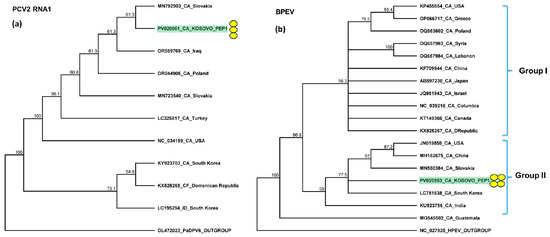Phylogenetic analysis of the (a) PCV2 and (b) BPEV variants found in Kosovo. The analysis was conducted using Geneious Tree Builder with the Tamura–Nei model, the neighbor-joining method, and 1000 bootstrap replicates. Green boxes highlight the pepper variants sequenced in this study. Subgroups of BPEV are indicated. Yellow dots indicate the variants sequenced in this study. The sequences are indicated by their GenBank accession numbers. The middle panel of the legend presents the host plant species using the following abbreviations: CA—Capsicum annuum, CF—Capsicum frutescens, and ID—Ixeridium dentatum.
