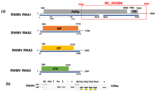 Results indicating the presence of RWMV. Cartoon representation of the RWMV genome. (a) RNA1, RNA2, RNA3, and RNA4 and the positions of the primers used for RT-PCR validation. The blue line indicates the region covered by the HTS sequencing results. The red box shows the region of the GenBank reference genome of the virus. (b) Validation of the presence of RWMV using RT-PCR. M represents the GeneRuler 100 bp Plus DNA Ladder; Pot indicates potato; T indicates tomato; Pe indicates the pepper pool; Σ denotes the combined pool of Pot, T, and Pe that was sequenced; −/+ denote negative and positive controls, respectively; Pe1, Pe2, Pe3, and Pe4 denote individual pepper plants. Yellow dots indicate the products that were cloned and sequenced.
