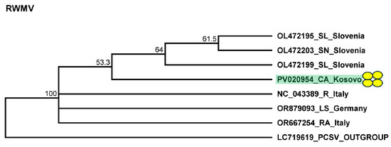 To validate the presence of the virus, we assessed the presence of RNA1. Our results showed that all of the pepper individuals were infected with RWMV. The sequences of the cloned portions of the RMWV variants present in the individuals were 92–95% identical to the other variants of the virus with sequences available in GenBank (Table S13). The variant present in Kosovo clustered with the variants sequenced in Slovenia (Figure 10).