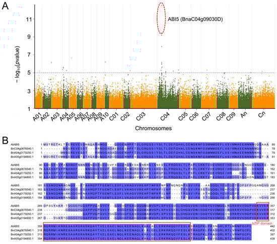 (A) The Manhattan plot shows the GWAS results for the drought survival rate phenotype. The dashed line represents the significance threshold, with a value of −log10 (p-value) = 5.75. The x-axis indicates the chromosomal positions, and the y-axis shows −log10 (p-value). The circled points indicate those SNPs located within BnaC04g09030D. (B) Multiple sequences alignment of putative amino encoded by AtABI5 and the three ABI5 homologous genes in the ZS6 reference genome. Identical amino acid residues across all four sequences are colored blue, with variants shown in light blue. The bZIP domain is indicated by a red box.
