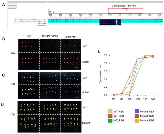 Gene editing of ABI5 in rapeseed. (A) Sanger sequencing results of CRISPR-CAS9-edited BnABI5. In the alignment, blue highlights identical PCR product sequences, while the dark background indicates regions matching the sgRNA. (B–D) Phenotypes of WT and mutant (BnABI5 CRISPR-edited lines) rapeseed seeds subjected to water, PEG, and ABA treatments at 24 h (B), 48 h (C), and 72 h (D). (E) Germination rates of rapeseed seeds under different treatments after different times. Mutant represents BnABI5 CRISPR-edited lines.