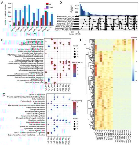 Differential expression analysis of BnABI5 CRISPR-edited lines compared to WT under different treatments. (A) The number of upregulated and downregulated genes in BnABI5 CRISPR-edited lines (mutant) under various treatments after different time points. (B,C) GO (B) and KEGG (C) enrichment analysis of downregulated genes in different treatment groups. (D) UpSet plot showing the number of unique and overlapping DEGs across 9 comparison groups. (E) Heatmap of gene expression for the 211 DEGs that are differentially expressed across all treatments. The color scale represents the Z-score of the gene expression level.