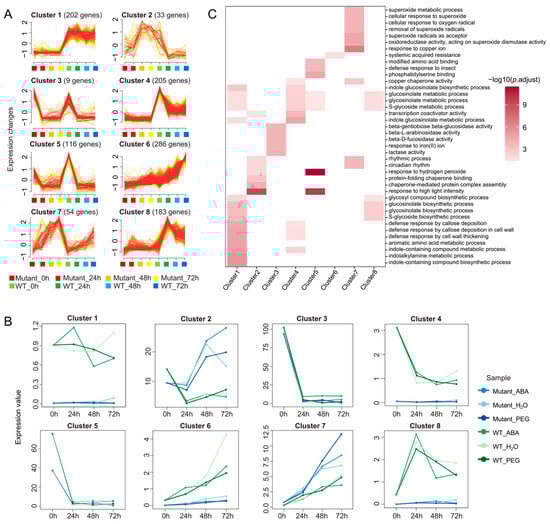To further analyze the temporal and treatment-specific response patterns of DEGs under stress treatments, we performed clustering analysis using mfuzz on 1179 DEGs that were differentially expressed in at least four out of six treatment groups. Based on the time-course dataset, these genes were assigned to 8 clusters, each containing between 33 and 286 genes (Figure 4A). The expression patterns of these clusters revealed that genes in cluster1, cluster4, cluster6, and cluster8 were predominantly highly expressed in WT plants, whereas genes in cluster2 and cluster7 were more highly expressed in BnABI5 CRISPR-edited lines (Figure 4B).