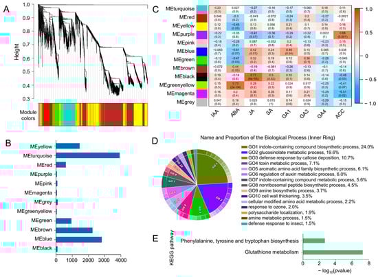 WGCNA of transcriptome and 8 hormone phenotypes. (A) Dendrogram displaying 12 co-expression modules identified by WGCNA across all samples. (B) Heatmap showing the correlation between the 12 modules and the levels of 9 plant hormones. Each row corresponds to a module represented by different colors, and each column represents one hormone. Red indicates a positive correlation between the module and the hormone, while blue indicates a negative correlation. (C) Bar chart illustrating the number of genes in each module. (D,E) GO (D) and KEGG (E) enrichment analysis results for the 44 genes in the MEgreenyellow module, which are significantly correlated with ABA.