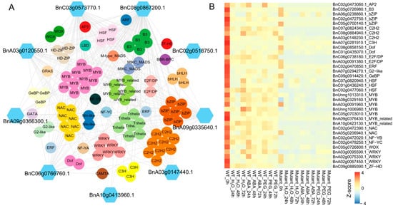 Protein sequences of TFs from all plant species were downloaded from the PlantTFDB 4.0 database []. These TF sequences were compared against the protein sequences of Brana_ZS_V2.0 using DIAMOND [] with the blastp algorithm to identify TFs in the B. napus genome. The PCC between differentially expressed TFs and genes was calculated in R. Gene-TF pairs with |PCC| > 0.8 and Q-value < 0.05 were retained. Co-expression networks of these gene-TF pairs were visualized using Cytoscape v3.9.1 [].