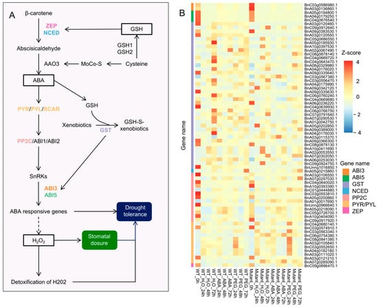 Drought-induced increases in GSH levels enhance the expression of ZEP (zeaxanthin epoxidase) and NCED (9-cis-epoxycarotenoid dioxygenase), promoting the conversion of β-carotene to abscisic aldehyde. Additionally, GST (glutathione S-transferase) mediates detoxification reactions and promotes the expression of ABI3 and ABI5, thereby activating ABA-responsive genes and enhancing plant drought resistance [] (Figure 7A). In the GSH-mediated drought regulatory pathway, 70 genes were differentially expressed in BnABI5 CRISPR-edited lines compared to WT, including 39 GST, 13 PP2C (protein phosphatase 2C), 11 PYR/PYL, 3 ABI5, 3 ABI3, 1 ZEP, and 1 NCED. Notably, BnC09g0896470.1 (ZEP) and BnA05g0215860.1 (NCED) showed increased expression levels with prolonged ABA and PEG treatments (Figure 7B), and ZEP expression was higher in BnABI5 CRISPR-edited lines than in WT. Two ABI3 genes (BnC03g0586980.1 and BnA03g0136860.1) and three ABI5 genes (BnA05g0194800.1, BnA04g0179250.1, and BnC04g0676540.1) exhibited high expression only at 0 h under water treatment, with reduced expression after treatment. Among the 39 GST genes, genes such as BnC08g0878140.1, BnA08g0329980.1, and BnA07g0302050.1 had higher expression levels in BnABI5 CRISPR-edited lines than in WT under drought (PEG) treatment. For PP2C, BnA07g0297030.1 showed elevated expression only in BnABI5 CRISPR-edited lines after 72 h of PEG treatment, while the other 12 PP2C genes were generally expressed at low levels. Three PYR/PYL/RCAR genes (BnA07g0285090.1, BnC03g0563340.1, and BnC06g0754380.1) exhibited increased expression after stress treatments, with overall higher expression in BnABI5 CRISPR-edited lines compared to WT. This suggests that GSH enhances ABA synthesis, thereby promoting the expression of PYR/PYL/RCAR while suppressing PP2C.