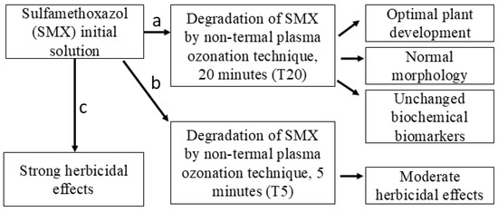 The pharmaceutical compound SMX was selected for this study based on its risk to non-target species [43], as well as its known herbicidal mode of action in plants [19,44]. SMX has been degraded using controlled conditions of NTP [35,36,45]. However, knowledge about plasma–soil–plant–antibiotics interactions is scarce. For this purpose, the following hypothesis was tested: the SMX-free solution obtained as a result of its degradation by NTP after 20 min treatment (T20) will significantly reduce the overall plant toxicity in Petri dish and pot experiment scales, while the initial solution (SMX) and its 5 min partial treatment sample (T5) will induce strong and moderate herbicidal effects, respectively. A schematic key concept model for testing this hypothesis is presented in Figure 1.