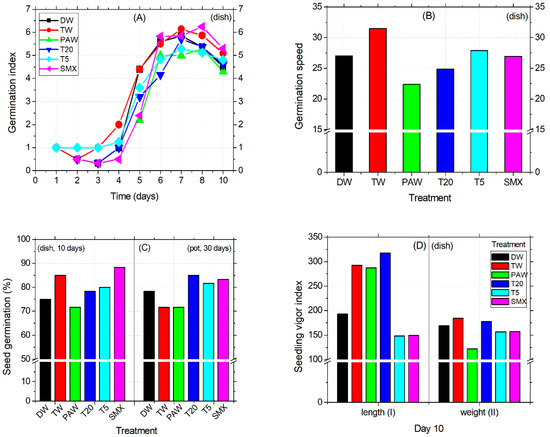 The seed germination was first initiated by TW and T5 treatments after 24 h, followed by T20 and SMX on the second day. At this time, TW had decreased to half of the previous day, by 0.5 units, and then was further restored until day 3. DW treatment induced physiological germination after three days of sowing, while T5 remained constant during this time period. PAW treatment slowed down the process by 48 h more than DW. Next, on day 6, the number of germinated seeds immersed in the PAW solution exceeded that of the previous date, thus reaching an index almost equal to that of DW and TW (Figure 2A). The low radicle emergence performance of PAW-soaked seeds during observations at the middle exposure time was further supported at the end of the experiment by the vigor index II (by weight). Here, the range differences in PAW treatment compared to the other treatments were between 30 and 60 units, suggesting a low seed fitness for germination capacity under these experimental conditions (Figure 2D). In contrast, the vigor I index of PAW (by length) was as appropriate as TW and T20 (day 10), leading to a final percentage of seed germination that remained the lowest of all the tested treatments (Figure 2C). Overall, the speed of seed germination decreases in the following order: TW > T5 > DW > SMX > T20 > PAW, as shown in Figure 2B.