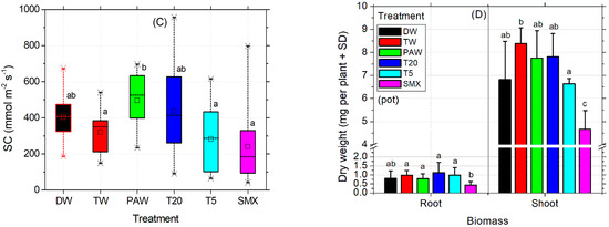 The absolute DW control increased the mean value of stomatal conductance in tomato seedlings by 83.7 units more than TW, while PAW had 90.99 units less. However, DW did not show significant differences of means between TW and the rest of the treatments, except PAW. In contrast, although PAW was appropriate for the absolute DW control, it significantly increased the evapotranspiration rates respecting TW, T5, and SMX irrigation solutions, suggesting a higher plant demand for the hydric regime under this condition. T20 was shown to induce similar responses to all plant treatments in terms of stomatal conductance analyses (Figure 4C). The dry root and shoot biomasses obtained in the pot-scale experiment for the absolute control (DW) did not show significant differences compared to the rest of the treatments (Figure 4D). On the other hand, the plants in the TW control had a similar root biomass as shown for PAW, T20, and T5 which were recorded with a higher dry weight compared to those in which SMX solution was used. Moreover, only the shoots irrigated with TW were significantly higher than those watered with T5 solution (Figure 4D).