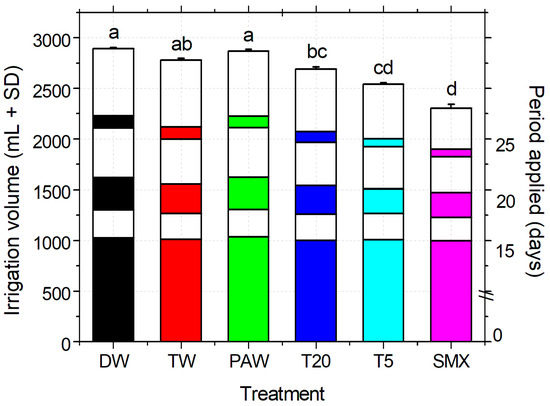 Irrigation treatments applied, volume, and timing, based on the experimental design, WHC of the selected soil, and the plant developmental stage. DW—distilled water (absolute control); TW—tap water (solvent control); PAW—plasma-activated water treatment of 20 min in plasma-ozonation system (plasma control); T20, T5—Initial SMX solution treated for 20 and 5 min respectively, using the NTP-ozonation system; SMX—untreated initial solution, 0.25 mM prepared in TW. The color of each column is correlated with the type of the solution applied for the entire paper, and the graph is plotted over six different treatment time periods, representing the total volume (+SD) of which three were treatments (days 0–15, 18–20, 25) and three DW (day 16–17, 21–24, 26–30) giving the spatial distribution of watering during the experiment. Statistical differences of means are marked with lowercase letters above the columns.