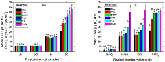 Physical–chemical analyses (A) (I) and (B) (II) of the soil after harvesting the plants. Legend: pH of the soil; EC—electrical conductivity; H—soil humidity; LOI—loss on ignition; DIN = N-NH4+ (ammonium) + N-NO3− (nitrate) + N-NO2− (nitrite)—dissolved inorganic nitrogen, P-PO43− (bioavailable phosphorus).