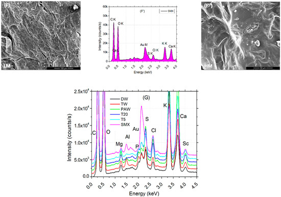Low (L) and high (H) images of the leaf surface reflect the tissue microarchitecture and state of stomata. It can be observed that the presence of the SMX concentration is correlated with the appearance of the crystal abundance on the probes from clean water (DW) to polluted water (SMX). A denser abundance can be observed in Figure 7E,E″ for T5 and also a blocked ostiole detailed in Figure 7F″ for SMX treatment. EDX analyses of leaves automatically detected the most abundant elements present in a sample from a distance of 50 μm above. Element differences between treatments were shown in separate plots and a merged spectra expanded to 1000 units of distance between treatments (Figure 7G). In the PAW sample, the element Mg was automatically detected (Figure 7C′), but not into the rest of the treatments, although still present (Figure 7G). Another particular finding was a decrease in Cu on the L line and the appearance of a high pick of Au on the M line in the SMX spectra (Figure 7F′).