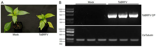 Symptoms of ToBRFV infection in pepper 13 days post-inoculation and viral RNA detection in the top leaves. (A) Symptoms in ‘Haonong 11’ pepper 13 days after ToBRFV inoculation. (B) Detection of viral capsid RNA in the top leaves of pepper from both mock and virus-inoculated groups, with CaTubulin as the reference gene.