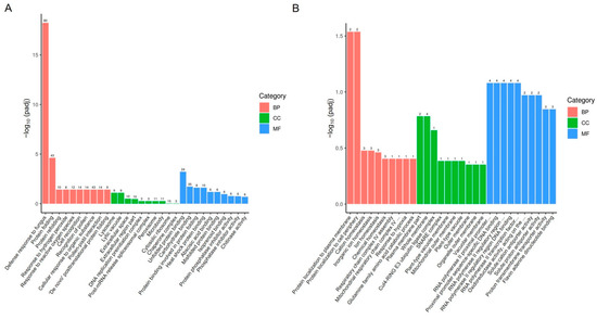 GO enrichment analysis of DEGs in pepper leaves 13 days after ToBRFV inoculation. (A) GO enrichment analysis of upregulated genes. (B) GO enrichment analysis of downregulated genes. The horizontal axis represents GO Terms, while the vertical axis indicates the significance level of GO Term enrichment, expressed as −log10 (padj). The values on the columns represent the number of DEGs enriched for that term, with different colors representing the three GO subcategories: BP, CC, and MF.