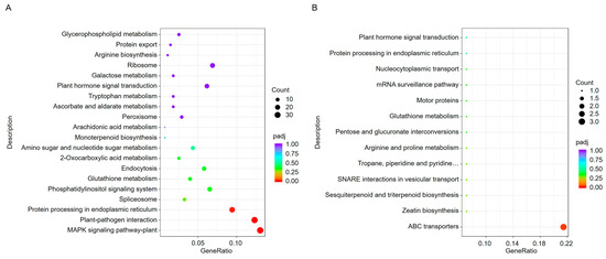 KEGG enrichment analysis of DEGs in pepper leaves 13 days after ToBRFV inoculation. (A) KEGG enrichment analysis of upregulated genes. (B) KEGG enrichment analysis of downregulated genes. The horizontal axis represents the ratio of the number of DEGs annotated to a KEGG pathway to the total number of DEGs. The vertical axis displays the KEGG pathways. The dot size corresponds to the number of genes annotated to each KEGG pathway, while the color gradient (from red to purple) indicates the significance level of the enrichment.