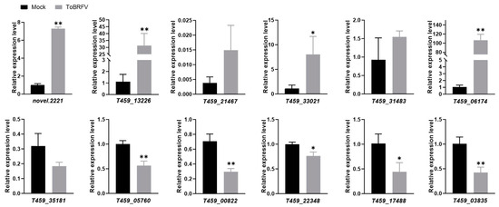 Validation of selected gene expression from RNA-Seq data using real-time quantitative PCR. Statistical analysis was performed using a Student’s t-test, with bar graphs representing mean ± SD. The asterisk indicates a statistically significant difference between the ToBRFV-inoculated group and the control group (* p < 0.05, ** p < 0.01). The experimental results were consistent across three repeated experiments.