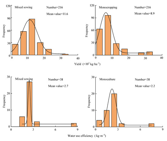 Under mixed sowing and monoculture conditions, the samples of forage yield and water use efficiency (WUE) were approximately normally distributed (Figure 1). The forage yield and WUE under mixed sowing ranged from 301.7 to 31,200 kg·ha−1 (average 11,608.3 kg·ha−1) and 1.4 to 8.3 kg·m−3 (average 2.7 kg·m−3), respectively. In comparison, the forage yield and WUE under monoculture ranged from 100 to 32,424 kg·ha−1 (average 8942.1 kg·ha−1) and 1.1 to 9.8 kg·m−3 (average 2.2 kg·m−3), respectively.