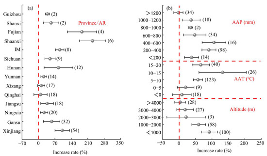 Regional factors, including province/autonomous region, annual precipitation, annual average temperature, and altitude, significantly influenced the yield effects of mixed sowing (Figure 2a). Among the provinces and regions, the highest yield increase effect of mixed sowing was observed in Shaanxi (average: 231 ± 64%), but this was not significantly different from that in Fujian (average: 185 ± 70%). The effects for Shanxi (average: 54.0%), Inner Mongolia (average: 90.9%), Sichuan (average: 49.4%), Hunan (average: 85.2%), Gansu (average: 56.3%), and Xinjiang (average: 101.4%), were exhibited varying results, while those for Guizhou (average: 38.1%), Yunnan (average: 22.7%), Jiangsu (average: 36.9%), and Ningxia (average: 24.1%) showed lower yield effects. The lowest yield increase effect was observed in Qinghai (average: 8.8%). Regarding climatic factors (Figure 2b), the yield effect of mixed sowing increased initially and then decreased with rising annual precipitation and average annual temperature. The highest yield effect was observed when the annual precipitation was 400–600 mm (average: 106 ± 41%), although this was not significantly different from the 200–400 mm range. Similarly, the highest yield effect occurred at an average annual temperature of 10–15 °C (average: 132 ± 71%), with no significant difference compared to the effects at 5–10 °C and 15–20 °C. Additionally, the yield effect of mixed sowing decreased with increasing altitude. The highest yield effect was observed at altitudes below 1000 m (average: 92 ± 31%), but it was not significantly different from the effects at altitudes of 1000–2000 m (average: 59.8%). At altitudes above 2000 m, the yield effect was not significant.