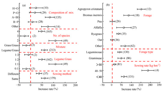 Mixed sowing factors primarily include composition of mix, no. of species, mixture, legume–grass ratio, and sowing method, (Figure 3a). The yield increase effect of mixed sowing was highest when alfalfa + Bromus inermis were combined (average: 83 ± 21%), whereas the yield effects of hairy vetch + oats (average: 23.0%), peas + oats (average: 18.4%), and ryegrass + peas (average: 7.8%) were not significant. When the number of forage allocations was two, the yield increase effect of mixed sowing was significantly the highest (average: 108 ± 37%). The effect was lower with four allocations (average: 47 ± 18%) and significantly decreased by 26.5% with three allocations. Mixed sowing of Leguminosae and Gramineae significantly increased the yield by 59.7% (95% CI: 42.6–76.8%), while mixing Gramineae with Gramineae resulted in a significant yield decrease of 19.4%. The yield increase rate of mixed sowing decreased as the proportion of Gramineae in the legume-to-grass ratio increased. The maximum yield increase effect was observed when the species ratio of Leguminosae to Gramineae was 1:1 (average: 108 ± 28%). Mixed sowing in the same rows exhibited a higher yield increase effect (average: 61 ± 16%), although the difference from mixed sowing in difference rows (average: 37 ± 13%) was not significant.