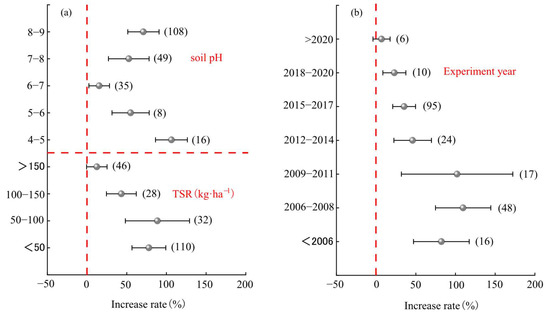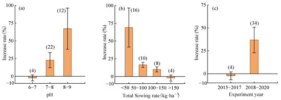 Soil pH, total sowing rate (Figure 4a), and experimental year (Figure 4b) significantly influenced the yield of mixed forage. With increasing soil pH, the yield effect of mixed sowing initially decreased and then increased. The highest average yield increase effect was observed at a soil pH of 4–5 (average: 106 ± 20%), although it was not significantly different from that at a soil pH of 8–9 (average: 71.0%). The yield increase effect of mixed forage initially rose and then declined with increasing total sowing rate and advancing experimental years. The highest average yield increase effects were observed at a total sowing rate of 50–100 kg·ha−1 (average: 89 ± 41%) and during the experimental years 2006–2008 (average: 110 ± 38%).