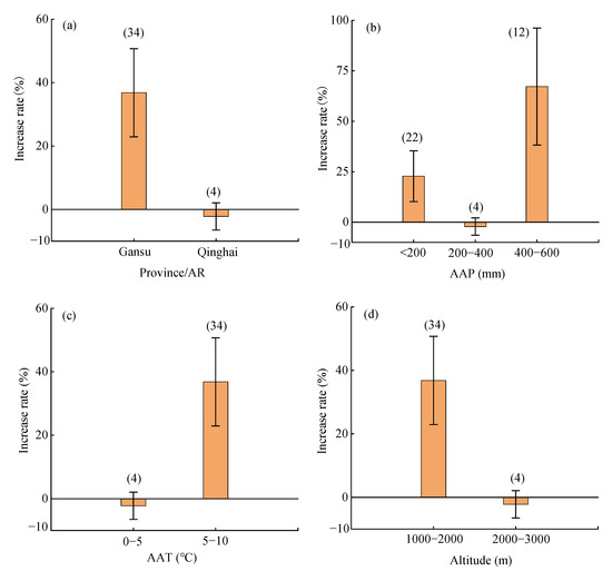 Region, average annual precipitation, average annual temperature, and altitude significantly influenced the water use efficiency (WUE) of mixed forage (Figure 5). In Gansu, the average WUE of mixed forage increased significantly by 36.8% (95%CI: 22.8–52.3%, Figure 5a), while the effect in Qinghai was not significant. As the average annual precipitation increased, the effect of mixed sowing on WUE showed a decreasing-then-increasing trend (Figure 5b). The highest increase in WUE was observed at an annual precipitation of 400–600 mm (average: 67 ± 32%). At an average annual temperature of 0–5 °C, WUE showed an insignificant decrease of −7.1–2.7%, while at 5–10 °C, it increased significantly by 22.8–52.3% (Figure 5c). At altitudes of 1000–2000 m and 2000–3000 m, WUE showed a significant increase of (22.8–52.3%) and an insignificant decrease of −7.1–2.7%, respectively (Figure 5d).