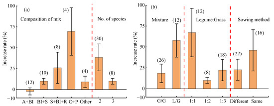 Composition of mix, no. of species, (Figure 6a), mixture, legume–grass ratio, and sowing method (Figure 6b) significantly influenced the water use efficiency (WUE) of mixed forage sowing. The highest increase in WUE was observed with the combination of oats + peas (average: 70 ± 32%), although this was not significantly different from that for sainfoin + Bromus inermis + ryegrass (average: 26 ± 16%). The average WUE increase effect was significantly higher when the number of forage allocation was two (average: 39 ± 18%) compared to three (Average: 10 ± 3%). Mixtures of Leguminosae and Gramineae resulted in a significantly higher WUE increase effect (average: 58 ± 22%) compared to that for Gramineae only (average: 19 ± 12%). When the species ratio of Leguminosae to Gramineae was 1:1, the WUE increase effect of mixed sowing was the highest (average: 67 ± 32%), and was significantly greater than that for ratios of 1:3 and 1:2. Compared to mixed sowing in same rows (average: 23 ± 14%), mixed sowing in different rows (average: 46 ± 28%) showed a higher WUE increase effect, although the difference was not significant.