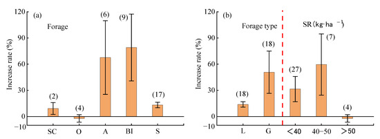 Forage, forage type, and sowing rate significantly influenced forage yield (Figure 3b). Among forage species, the highest yield increase effect was observed for Agropyron cristatum (average: 213 ± 27%), followed by Bromus inermis (average: 119.8%), alfalfa (average: 84.6%), and other forage species (average: 93.7%). Ryegrass showed the lowest yield increase effect (average: 46.3%), while the yield effects of peas (average: 1.1%) and oats (average: −0.3%) were not significant