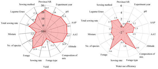 The importance of factors influencing the yield and water use efficiency (WUE) improvement effects of mixed sowing was analyzed using a random forest model (Figure 9). For yield, among the top three influencing factors, the first comprises annual average precipitation (24.3%), annual average temp (23.7%), provinces/AR (22.7%), and soil Ph (22.4). The second is forage (21.4), and the third is altitude (20.9). The bottom three factors were the species ratio of Leguminosae to Gramineae (10.7%), forage allocation type (3.3%), and forage allocation (1.3%). For WUE, the top three influencing factors were forage allocation (4.6%), forage type (4.4%), and species ratio of Leguminosae to Gramineae (2.7%). The bottom three factors were experimental year (0.8%), experimental region (−0.8%), and altitude (−0.9%). It can be seen that regional factors (provinces/AR, annual average precipitation, average annual temperature, altitude, etc.) have a greater influence than management factors on mixed forage yield, whereas for mixed forage WUE, this effect is not significant due to the small sample size.