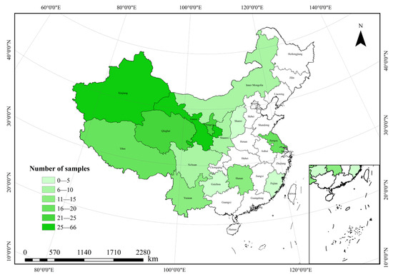 Through employing the Chinese knowledge network (http://www.cnki.net/) and Web of Science (http://apps.webofknowledge.com/) to retrieve databases in both English and Chinese, the Chinese knowledge network: URL: http://apps.webofknowledge.com/ (accessed on 1 March 2023), Web of Science: URL: http://apps.webofknowledge.com/ (accessed on 1 March 2023). experimental studies on the effects of mixed sowing mode on forage yield and water use efficiency published at home and abroad before March 2023 were comprehensively collected. The Chinese search terms included “forage”, “mixed sowing”, “yield”, and “water use efficiency”; the English search terms include “forage”, “mixed sowing”, “yield”, and “water use efficiency”. The search was limited to the title, abstract, and keywords of the paper. In order to reduce the bias caused by literature collection, the analysis samples of this study were selected based on the following criteria: (1) the experiment was located in China and conducted in the field; (2) controls for both the mixture and the monoculture were included; (3) the forage yield and/or water use efficiency for the treatments were listed in the paper, and their mean and standard deviation were directly given, or they could be calculated according to the existing data; (4) the year the experiment was conducted, the type, the proportions of the different species, the method of sowing, and the sowing rate were reported; (5) the rainfall, temperature, elevation, and soil pH for the site were available. After screening using the above criteria, a total of 148 research papers were obtained, including 237 sets of yield data and 78 sets of water use efficiency data. Figure 10 is distribution of regional sample size in this study.