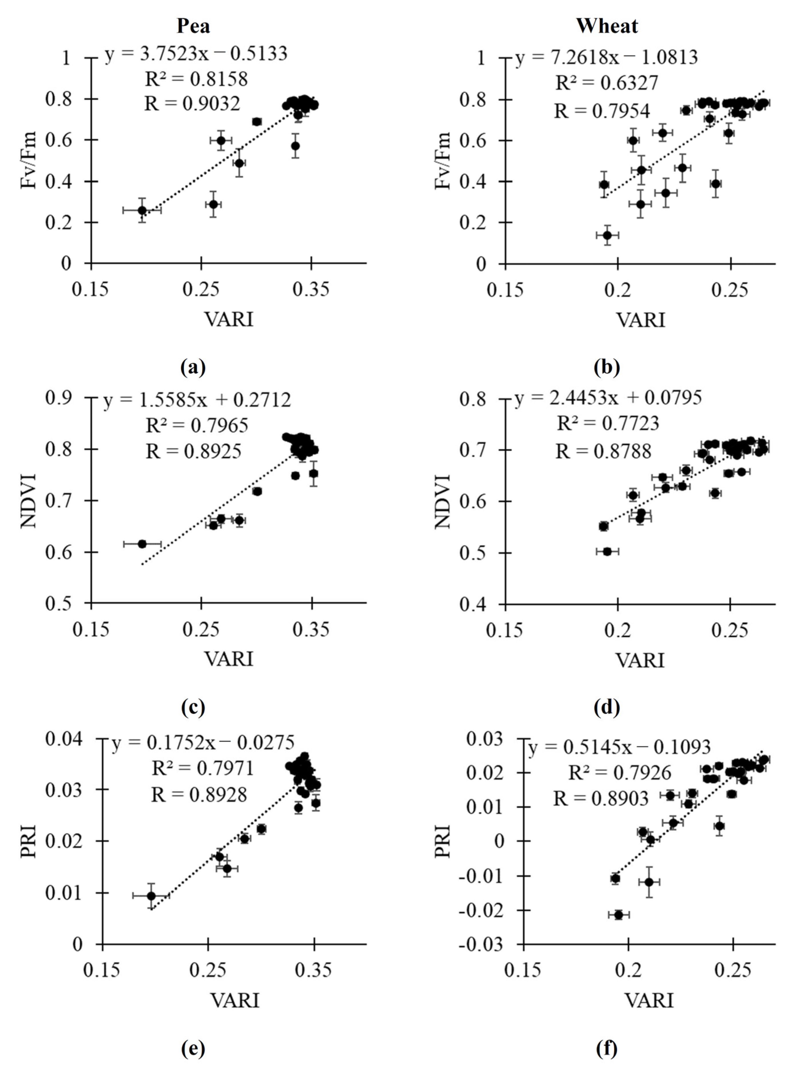 Figure 8. Relationships of VARI to Fv/Fm, NDVI, and PRI. (a) Scatter plots between VARI and Fv/Fm in pea plants. (b) Scatter plots between VARI and Fv/Fm in wheat plants. (c) Scatter plots between VARI and NDVI in pea plants. (d) Scatter plots between VARI and NDVI in wheat plants. (e) Scatter plots between VARI and PRI in pea plants. (f) Scatter plots between VARI and PRI in wheat plants. Average values of parameters in control plants, plants under soil drought, and plants under salinization in all time points were analyzed (n = 30). R2 and R are determination and correlation coefficients, respectively.