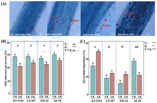 Effects of AMF colonization in four wheat varieties. (A) Acid-ink staining of wheat root after AMF colonization, bar = 50 μm. (B) AMF colonization rate in the root of four wheat varieties under normal potassium (CK) and low potassium (LK) stress treatments. (C) Mycorrhizal dependency of AMF in the root of four wheat varieties under CK and LK stress treatments. AMF of Rhizophagus intraradices (RI) were applied in this study. Four wheat varieties were Kenong 9204 (KN-9204), Lunxuan 987 (LX-987), Xinmai 26 (XM-26), and Aikang 58 (AK-58). Asterisks indicate significant differences in variety (V) and K level (K) and their interactions [Kruskal–Wallis test, n = 3, p < 0.01 (**), p < 0.001 (***) and p > 0.05 (ns)]. Data present means ± SE (n = 3). Different letters are used to indicate significant differences; the small letters indicate differences between treatments within each variety, and the capital letters indicate differences between varieties (Tukey’s test, n = 3, p < 0.05).