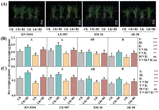 To explore the effects of AMF on wheat growth, the phenotypes of the four wheat varieties were recorded on days 10–30. The results indicated that, after RI inoculation, the growth phenotypes of all four wheat varieties under CK and LK treatments were significantly improved (Figure 2A). Compared with the CK treatment alone, the dry and fresh weights increased by 29.4% and 32.5% in KN-9204, 34.4% and 18.7% in LX-987, 3.4% and 12.8% in XM-26, and 35.2% and 38.7% in AK-58 under the CK + RI treatments (CK with added RI) (Figure 2B,C). Under the LK + RI treatments (LK with added RI), increases of 50.0% and 48.6%, 27.1% and 24.1%, 7.1% and 23.0%, and 45.5% and 22.0% were recorded, relative to LK alone (Figure 2B,C). Moreover, interaction analysis found that the fresh and dry weights were significantly different by wheat variety (V), AMF inoculation (M), and K level (K). These results suggest that RI inoculation significantly improved wheat growth under both CK and LK treatments, particularly in KN-9204.