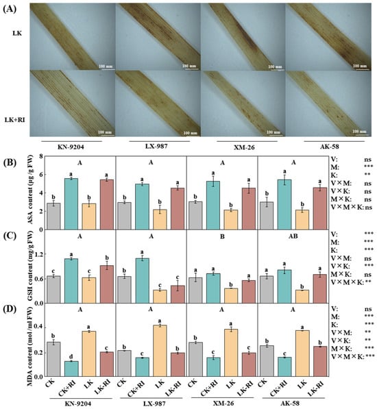 To identify the roles of RI in wheat antioxidant defense, antioxidant substances, such as ascorbate (ASA), glutathione (GSH), malondialdehyde (MDA), and hydrogen peroxide (H2O2), were measured in wheat under different treatments. DAB (3,3-diaminobenzidine) staining showed that the leaf color, which represents H2O2 content, was significantly changed in the leaves of the four wheat varieties and was darker in no-RI-inoculated group than in the RI inoculation treatment (Figure 3A). Moreover, under the CK + RI condition, ASA content was significantly increased by 93.8%, 66.9%, 74.6%, and 80.6% in KN-9204, LX-987, XM-26, and AK-58; it was even more significantly increased under the LK + RI condition, with increments of 94.2%, 107.5%, 114.7%, and 116.1% (Figure 3B), respectively. Interaction analysis found that the ASA contents differed significantly by AMF inoculation and K level but not by wheat variety (Figure 3B). Similarly, under the CK + RI condition, GSH content increased significantly—by 62.5% and 67.2%—in KN-9204 and LX-987, while there were no changes in XM-26 and AK-58 (Figure 3C). Conversely, under the LK + RI condition, GSH contents were significantly increased in these latter two varieties—by 54.4% and 122.8%, respectively—but they were not changed in KN-9204 and LX-987 (Figure 3C). Interaction analysis found that GSH contents differed significantly by wheat variety, AMF inoculation, and K level (Figure 3C). Furthermore, under the CK + RI condition, MDA content was significantly decreased by 58.5%, 27.5%, 44.5%, and 37.7% in KN-9204, LX-987, XM-26, and AK-58; it was also significantly decreased under the LK + RI treatments, with decreases of 45.8%, 54.0%, 49.7%, and 34.3% (Figure 3D), respectively. Interaction analysis found that MDA content differed significantly by AMF inoculation and K level but not by wheat variety (Figure 3D).