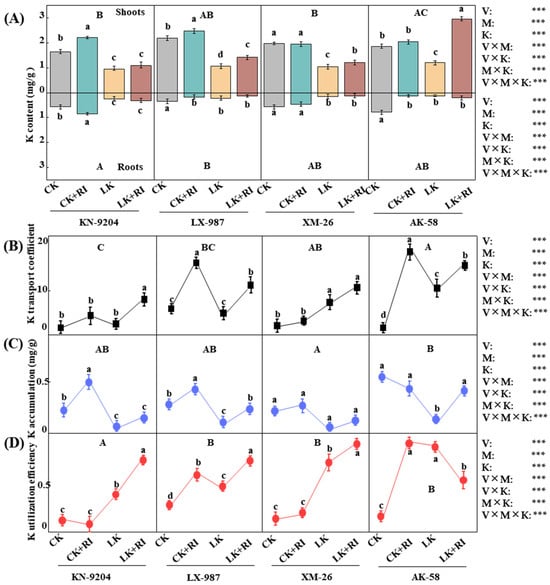 Effects of AMF-RI colonization on the K uptake of four wheat varieties under CK and LK stress treatments. (A) K content in four wheat varieties at 30 d after AMF-RI colonization. (B) K transport coefficient in four wheat varieties at 30 d after AMF-RI colonization. (C) K accumulation in four wheat varieties at 30 d after AMF-RI colonization. (D) K utilization efficiency in four wheat varieties at 30 d after AMF-RI colonization. CK, normal potassium; CK + RI, CK added with Rhizophagus intraradices (RI); LK, low potassium; LK + RI, LK added with RI. Four wheat varieties were Kenong 9204 (KN-9204), Lunxuan 987 (LX-987), Xinmai 26 (XM-26), and Aikang 58 (AK-58). Asterisks indicate significant differences in variety (V), AMF inoculation (M), K level (K), and their interactions [Kruskal–Wallis test, n = 3, p < 0.001 (***)]. Data present means ± SE (n = 3). Different letters are used to indicate significant differences; the small letters indicate differences between treatments within each variety, and the capital letters indicate differences between varieties (Tukey’s test, n = 3, p < 0.05).