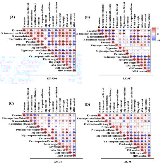 The relationship between AMF and various indices in four wheat seedlings was determined using correlation analysis. The results showed that there were different correlations between the various induces in the four wheat plants (Figure 5). At the p ≤ 0.001 level, K content was significantly positively correlated with K accumulation, the P transport coefficient, and GSH content in KN-9204; K accumulation, P content, and dry weight in LX-987; and K accumulation in XM-26. It was also negatively correlated with the transfer coefficients of Mg and Ca in KN-9204; the K transport coefficient and K utilization efficiency in LX-987; and the K transport coefficient, K utilization efficiency, and Mg content in XM-26 (Figure 5A–D). In addition to the above indexes, at the p ≤ 0.01 level, K content was also significantly positively correlated with fresh and dry weight in KN-9204, fresh weight in LX-987, and K accumulation and the P transport coefficient in AK-58, and it was negatively correlated with MDA and Mg content in KN-9204, the Mg transport coefficient and MDA content in LX-987, and the Mg transport coefficient in AK-58 (Figure 5A–D). Moreover, at the p ≤ 0.05 level, K content was positively correlated with P content and GSH content in XM-26 and with GSH content in AK-58, and it was negatively correlated with Mg content and the Ca transport coefficient in LX-987 and with the Ca transport coefficient in AK-58 (Figure 5A–D). These results showed the following separate relationships with K content: nine indexes were significantly correlated for KN-9204, with five positively and four negatively correlated; ten indexes were significantly correlated for LX-987, four positively and six negatively; and finally, for XM-26 and AK-58, there were significant correlations with six indexes, three positively and three negatively (Figure 5A–D). Among these, K content was more significantly positively correlated with other indexes in KN-9204 than in the other three wheat varieties. Thus, KN-9204 was selected and used for further experiments.
