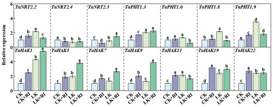 To understand the molecular mechanism of how AMF regulate the uptake and transport of elements in wheat roots, several genes involved the transport and uptake of N (TaNRT2.2, TaNRT2.4, and TaNRT2.5), P (TaPHT1.3, TaPHT1.6, TaPHT1.8, and TaPHT1.9), and K (TaHAK1, TaHAK5, TaHAK7, TaHAK9, TaHAK11, TaHAK19 and TaHAK22), as reported in previous studies [30,31,32], were selected and measured in this study. The results showed that the expression levels of several N and P transporter genes, such as TaNRT2.2, TaPHT1.3, and TaPHT1.9, and those of all K transporter genes (TaHAK1, TaHAK5, TaHAK7, TaHAK9, TaHAK11, TaHAK19, and TaHAK22), were significantly induced under the LK, CK + RI, and LK + RI treatments (Figure 6). Compared with CK, the K transporter genes TaHAK1, TaHAK5, TaHAK7, TaHAK9, TaHAK11, TaHAK19, and TaHAK22 were significantly increased by 148.6%, 85.6%, 85.6%, 152.7%, 112.1%, 230.8%, and 166.0% under the CK + RI treatments and by 399.8%, 278.9%, 278.9%, 226.4%, 62.1%, 197.0%, and 141.8% under the LK + RI treatments (Figure 6), respectively. However, only the N transporter genes TaNRT2.2 (increased by 54.2% and 27.0%) and the P transporter genes TaPHT1.3 (increased by 70.4% and 122.1%) and TaPHT1.9 (increased by 68.4% and 78.6%) were induced under both the CK + RI and LK + RI treatments (Figure 6). Among these genes, only the expression levels of TaHAK1, TaHAK5, TaHAK7, TaHAK9, and TaPHT1.3 were more significantly increased under the LK + RI condition than under the CK + RI condition, suggesting that these genes play a crucial role in AMF’s improvement of the uptake and transport of elements under the LK stress treatments (Figure 6).
