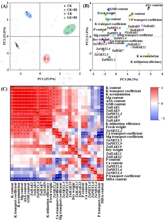 Principal component analysis (PCA) and Pearson correlation analyses of different indicators in KN-9204 after AMF-RI colonization under CK and LK stress treatments. (A) PCA of four treatments, which contained CK, CK + RI, LK, and LK + RI. (B) PCA of different indicators, which were measured in this study, in KN-9204. (C) Pearson correlation analyses of different indicators, which were measured in this study, in KN-9204. CK, normal potassium; CK + RI, CK added with Rhizophagus intraradices (RI); LK, low potassium; LK + RI, LK added with RI. Gradient color bars denote the correlation coefficient between physiological indexes. The asterisks indicate a significant correlation in the data [p < 0.05 (*), p < 0.01 (**), p < 0.001 (***)].