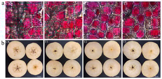 Figure 1a illustrates that the apple epidermal cells treated with CK and T1 are not uniformly colored, have irregular sizes, and are not densely grouped. In contrast, the epidermal cells treated with T2 exhibit consistent cell size, minimal cell gaps, a tight arrangement, and uniform staining.