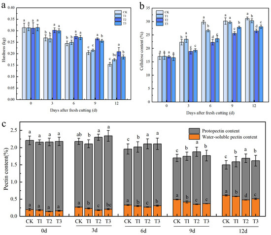 Changes in fruit hardness, cellulose content, and pectin contents after fresh-cutting of apples in different calcium preparation treatment groups. (a) Hardness of fresh-cut apples. (b) Cellulose content of fresh-cut apples. (c) Pectin contents of fresh-cut apples. The error bars represent the SD of three biological replicates. Different lowercase letters in the same developmental stage are significant differences at p < 0.05.