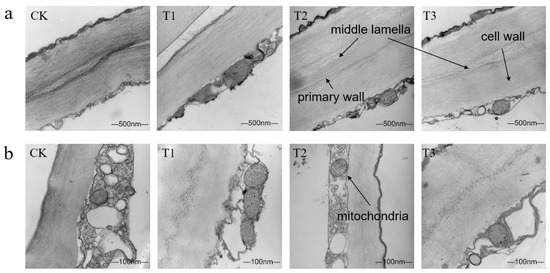 As observed in Figure 3, the cell wall of the apple pulp has only a primary wall and no secondary wall. The ultrastructural changes of the apple pulp cell wall were significantly different 12 days after fresh-cutting. The cell wall in the T2 treatment was neat, consistently thick, and intact, forming a distinct bright–dark–bright partition structure with a thin intercellular layer. The dark electron-dense layer was uniform and continuous, the content was rich, the membrane structure was intact, and there was no plasmolysis (T2a). In contrast, the intercellular layer in the CK treatment showed slight cracking, and the cell wall exhibited bending deformation with a significantly reduced density in the dark middle layer (CKa). The intercellular layer in the T1 treatment was completely broken, with large spacing, and the cell wall began to bend and deform (T1a). Twelve days after fresh-cutting, the cytoplasm and contents of the apple were compressed into a thin layer close to the cell wall, and the intracellular structure of each treatment was significantly different. The intracellular structure in the T2 treatment was neatly and evenly arranged, with clearly identifiable and undamaged mitochondria and other organelles (T2b), and the apple had the highest hardness at 0.209 kg·cm−2. In the T3 treatment, fruit inclusions were thinner and evenly distributed, with intact cell walls, membrane systems, and mitochondria, though plasmolysis had begun (T3b). The cell wall in the T1 treatment remained neat and intact, with an intact membrane structure, but material accumulation was thick and uneven, and plasmolysis was evident (T1b). In the CK treatment, the endoplasmic structure was disordered and blurred, mitochondrial structure was broken, intercellular substances were degraded, and plasmolysis was severe (CKb). These results indicate that different calcium preparation treatments had varying effects on the ultrastructure of fresh-cut apple cells, with the sorbitol-chelated calcium treatment having the best effect on the integrity of the cell wall, intercellular layer, and mitochondria in fresh-cut fruits.