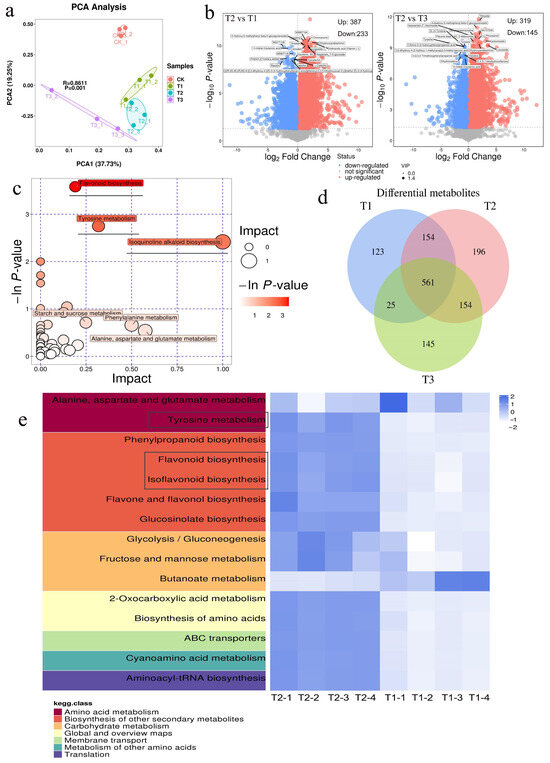 Effects of sorbitol-chelated calcium on metabolomics of fresh-cut apples during storage. (a) Principal component analysis, PCA plot. (b) Volcano plot of differential metabolites. (c) Pathway analysis for T2 vs. T1 groups. (d) Venn diagram of differential metabolites. (e) KEGG heatmap for T2 vs. T1 groups.