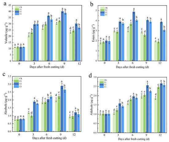 Effects of different calcium treatments after harvest on aroma and volatile components of fruit during storage. (a) Content of total volatiles. (b) Content of ester substances. (c) Content of alcohols. (d) Content of aldehydes. CK, T1, T2, and T3 represent the different treatments of control, calcium chloride, sorbitol-chelated calcium, and calcium nitrate. The error bars represent the SD of three biological replicates. Different lowercase letters in the same developmental stage indicate a significant difference at p < 0.05.