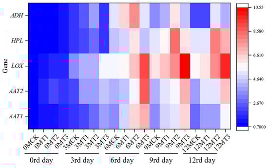 Alcohol acyltransferase 1 (AAT1) and alcohol acyltransferase 2 (AAT2) catalyze ester formation, key to aromas in apples. Lipoxygenase (LOX) oxidizes fatty acids, producing aldehydes and alcohols for scents in apples. Alcohol dehydrogenase (ADH) converts aldehydes to alcohols, influencing aromas in apples. Hydroperoxide lyase (HPL) cleaves hydroperoxides, generating aldehydes for scents in apples. These genes regulate metabolic pathways, shaping apple aroma profiles. As shown in Figure 6, the expression levels of aroma-related genes AAT1, AAT2, LOX, HPL, and ADH in differently treated fruits during storage were considerably different. The overall trend initially exhibited an increase and subsequently decreased. The expression levels of AAT1, AAT2, and LOX in the T2 treatment during storage were significantly higher than those in other treatments. AAT1 and AAT2 exhibited significant peak expression on day 6, which were 2.01 and 2.20 times that of the CK group, respectively, while LOX was 1.74 times that of the CK group on day 9. The expression levels of HPL and ADH in the T2 treatment were significantly higher than those in the other treatments, reaching a maximum on days 6 and 9, which were 1.61 times and 1.53 times those of the CK group, respectively. This indicates that the effect of sorbitol-chelated calcium on the expression of fruit aroma substances AAT1, AAT2, HPL, and ADH was remarkable, while the observable effect of calcium nitrate was on the expression of LOX.